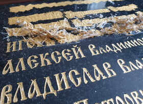 После небольшого совещания, было решено изготовить новые таблички из гранита. Помимо этого мы, с согласия заказчика, увеличили размер букв и изменили шрифт на тот, который я называю «в православном стиле». Обговорив детали и украшающий орнамент, мы изготовили несколько трафаретов для дальнейшей гравировки.