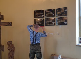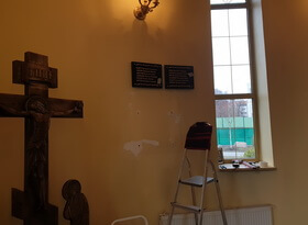В день монтажа мы доставили готовые таблички в храм, предварительно сняв со стены висевшую там мраморную доску.